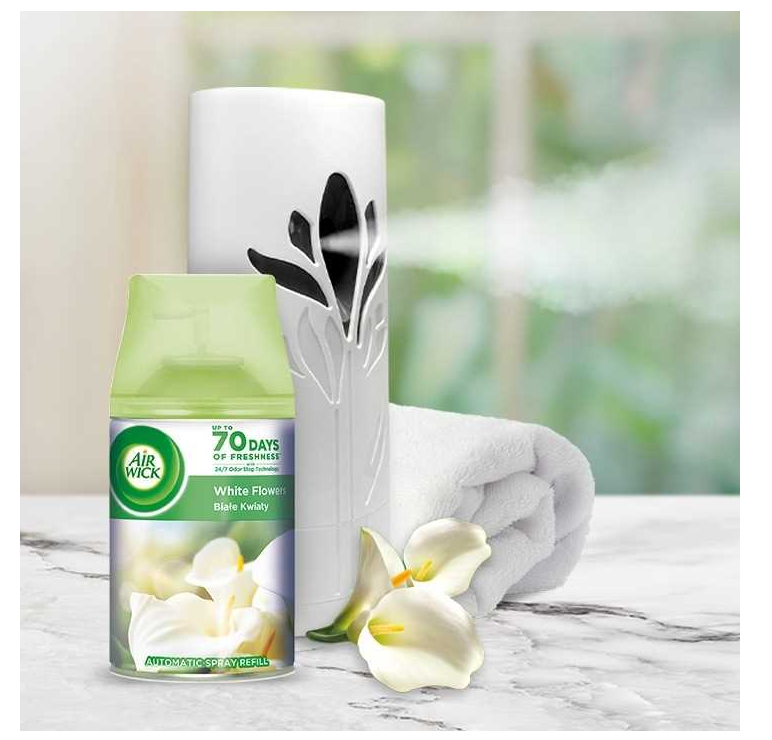 Air Wick Freshmatic Original Biele kvety & Frezie je ideálny pre každú domácnosť, ktorá chce udržať stálu vôňu čistoty a kvetinovej sviežosti. Vhodný do obývačky, chodby, kúpeľne aj spálne.