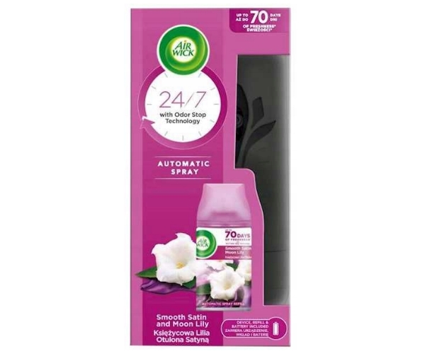 EN SEO: Air Wick Freshmatic air freshener, Moon Lily & Satin scent, automatic air freshener, 250 ml refill included, odor neutralizer, long-lasting fragrance up to 60 days, 3 scent intensity levels, up to 2400 scent doses, wall mount or shelf placement, 2× AA battery powered, complete device + refill set, home fragrance, fresh home scent, scented home, Air Wick diffuser, floral aroma, |