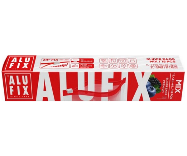 AluFix ZIP-FIX Zipsové vrecia s posuvníkom na skladovanie potravín, mix veľkostí, 15 kusov