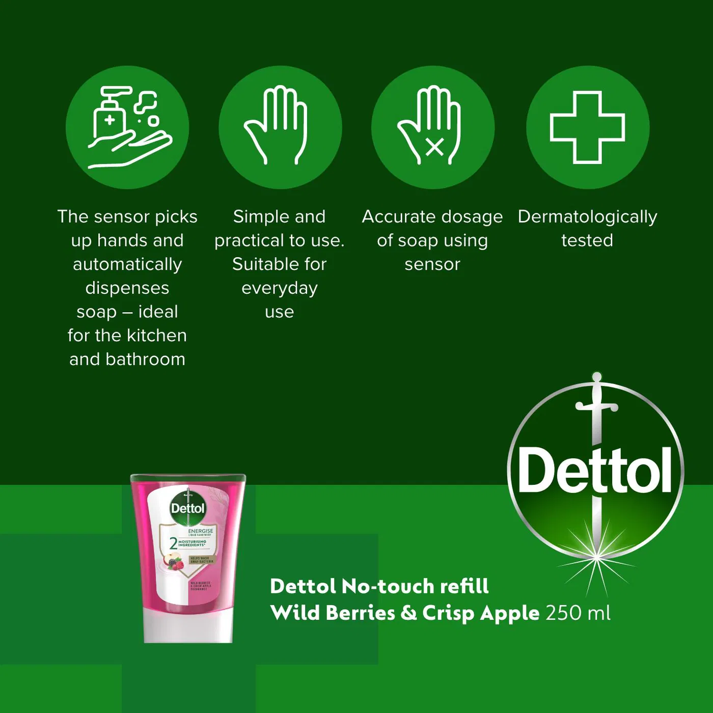 Dettol liquid soap refill forest fruits, refill for touchless dispenser, moisturizing antibacterial hand soap, 250 ml liquid soap, daily hand hygiene soap, Dettol hand wash refill, gentle hand cleanser, forest fruits fragrance.