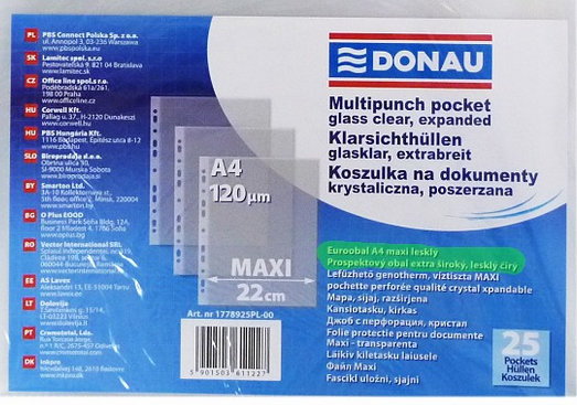 euroobal DONAU A4 maxi extra široký priehľadný lesklý 120 mikrónov PP fólia na dokumenty kancelárske potreby obal na papier 25 ks |