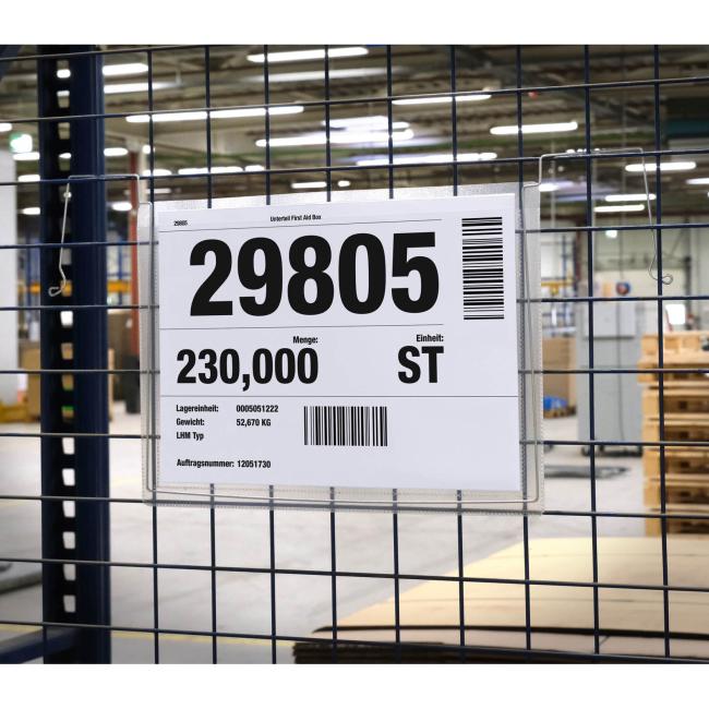 Drôtené vrecko na dokumenty A5 na šírku je vyrobené z priehľadnej polypropylénovej (PP) fólie a je vybavené pozinkovaným, flexibilným drôtom, ktorý umožňuje jednoduché a bezpečné uchytenie. Je určené na použitie na prepravné kontajnery, sieťované kontajnery, drevené nosné rámy a paletové kartóny.