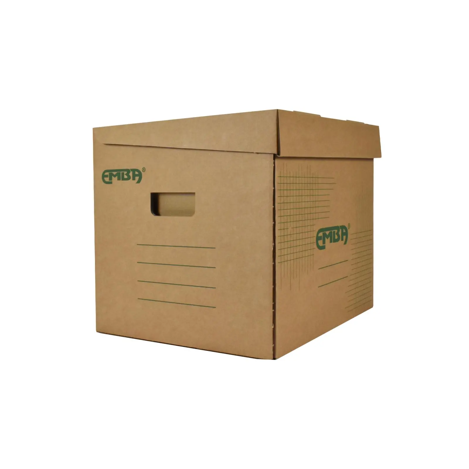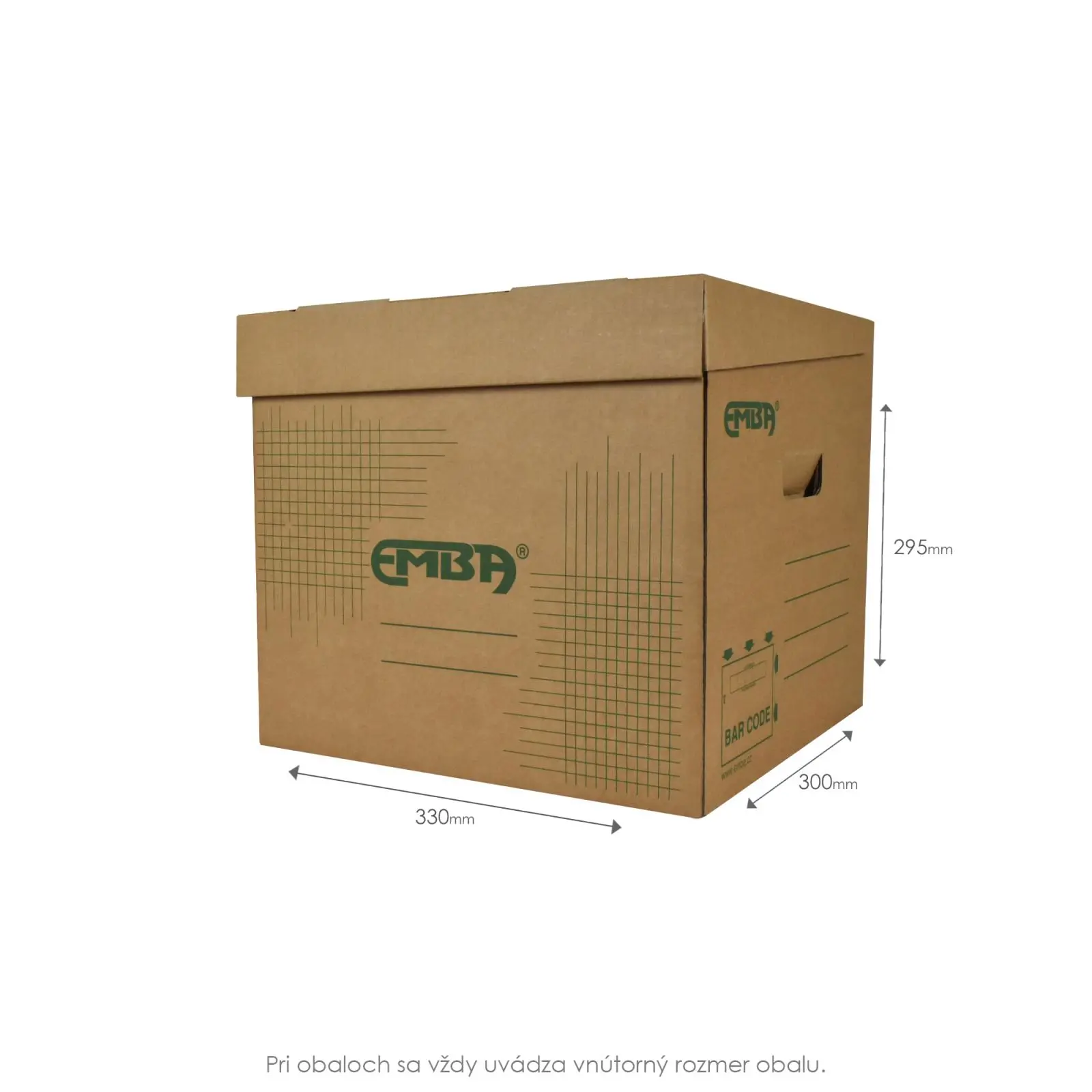 Úložná škatuľa vyrobená s výklopným vrchnákom z hnedej vlnitej lepenky. Určená na uloženie 4 ks zakladačov šírky chrbta 8 cm alebo archívnych boxov EMBA TYP I/75. Rozmery 330x300x295 mm.