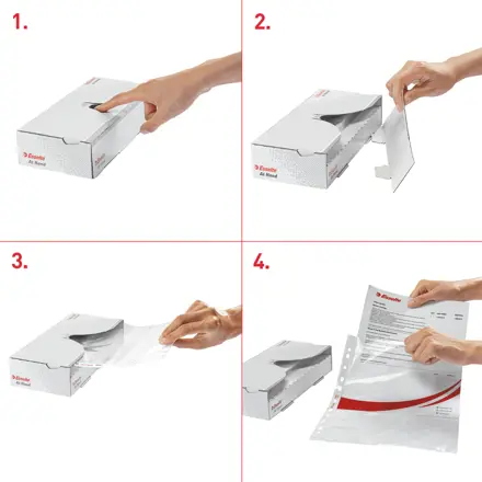 Esselte At Hand závesné obaly A4, plastové obaly v zásobníku, obaly s patentovaným systémom vyťahovania, závesné euroobaly 55 mikrónov, copysafe fólia, praktické kancelárske obaly Esselte, obaly na dokumenty s multiperforáciou