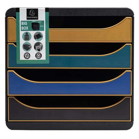 zásuvkový box A4+, Exacompta Neo Deco Big Box, čierny korpus, art deco dizajn, 4 zásuvky, farebné zásuvky, plastový organizér, úložný box na dokumenty, kancelársky zásuvkový box, úložný systém pre dokumenty A4+, recyklovaný plast, Modrý anjel certifikát, pevný odolný box, kancelársky úložný modul, zásuvková skrinka, modulárny organizér, box na veľkoformátové obálky, kancelárske potreby, box na spisy
