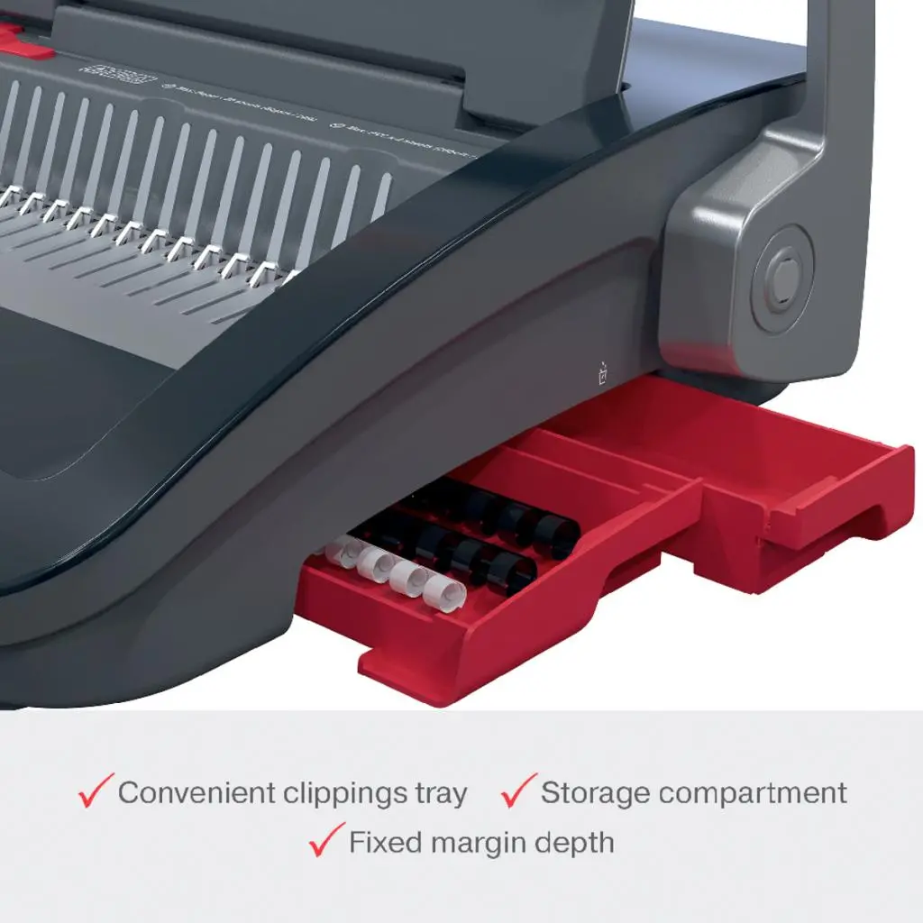 Viazač je vybavený zásobníkom na odrezky pre jednoduché vyprázdnenie a praktickým úložným priestorom. Ručné ovládanie s jednou pákou, protišmykové nožičky a nastaviteľný bočný okraj zabezpečujú pohodlné a presné viazanie s profesionálnym výsledkom. Je vhodný pre dokumenty vo formáte A4 aj A5.