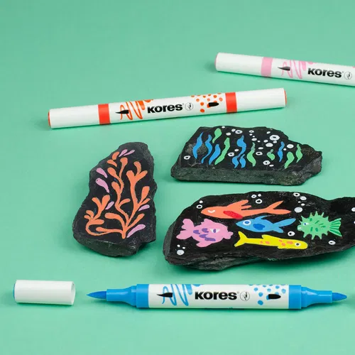 KORES akrylové popisovače 2v1 ponúkajú spojenie písacích a výtvarných potrieb v jednom. Sú vybavené obojstranným hrotom – štetcovým a kónickým (guľatým), vďaka čomu umožňujú široké spektrum techník od precízneho písania až po umelecké tieňovanie. Kvalitná akrylová farba na vodnej báze zaručuje sýte, trvácne a krycie farby, ktoré rýchlo schnú a nešpinia ruky.