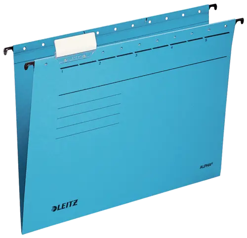 Leitz ALPHA V suspension files blue, A4 hanging files open sides, strong rails, index tab with replaceable label, cut-outs for prong fastener, FSC certified filing supplies, office filing, olhaoffice