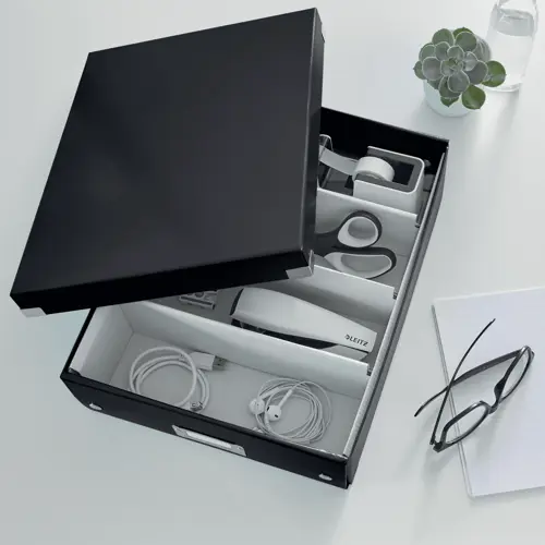 Elegantný a praktický organizér z rady Leitz WOW pomáha udržať poriadok v domácnosti, kancelárii, škole alebo na pracovisku. Táto stredne veľká úložná krabica s vrchnákom poskytuje nielen prémiový vzhľad, ale aj spoľahlivé a udržateľné riešenie na organizáciu každodenných potrieb.