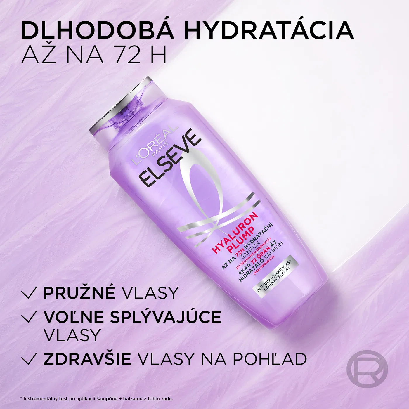 L'ORÉAL ELSEVE Hyaluron Plump 72H šampón s kyselinou hyalurónovou poskytuje až 10× viac hydratácie po dobu 72 hodín. Je vhodný pre všetky typy vlasov, najmä pre jemné a rednúce vlasy. Vlasy vyplňuje, spevňuje a zanecháva ich lesklé a pružné.