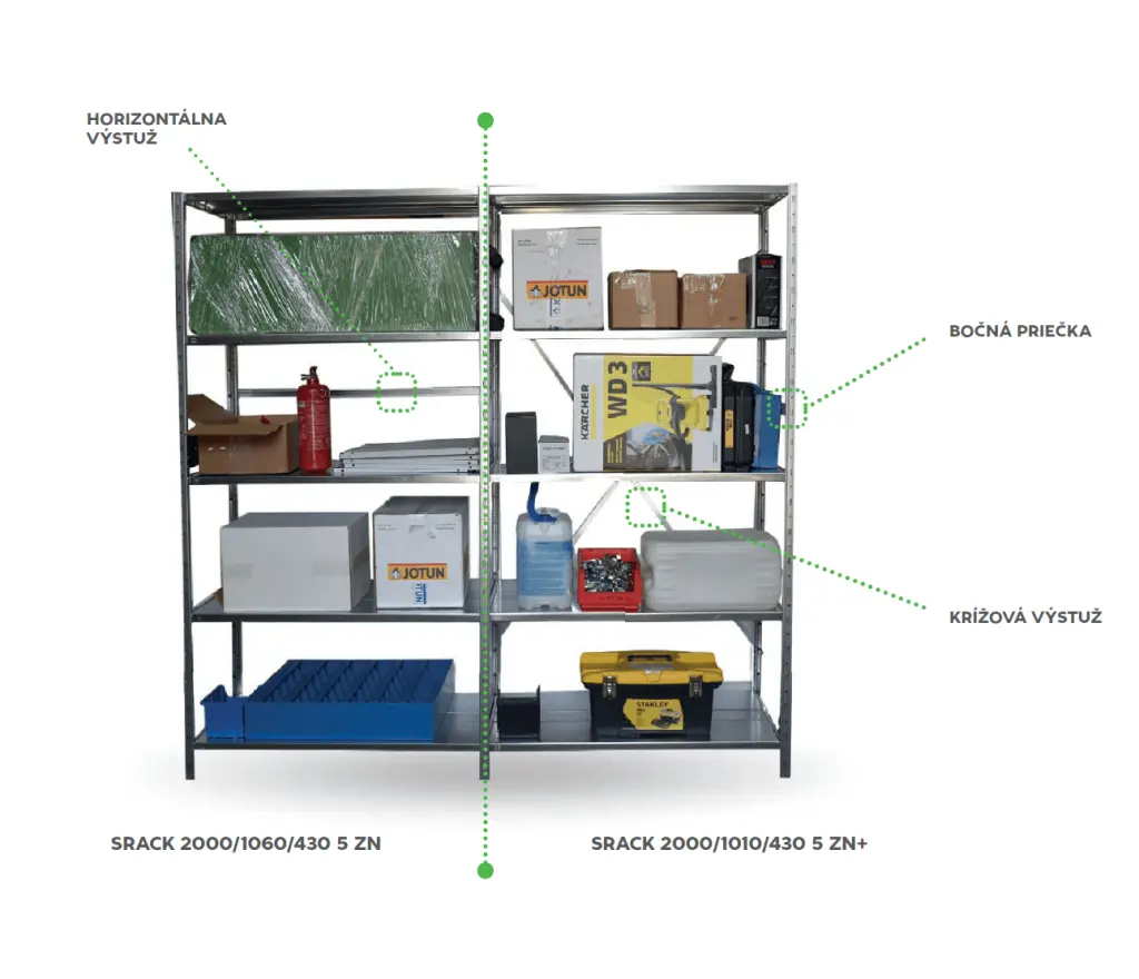 SRACK 2000/1010/430 5 ZN+ je prídavný modul k policovému regálu SRACK 2000/1060/430 5 ZN. Prídavný modul stojí na 2 nohách a je pripevnený k základnému modulu.