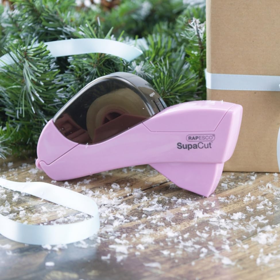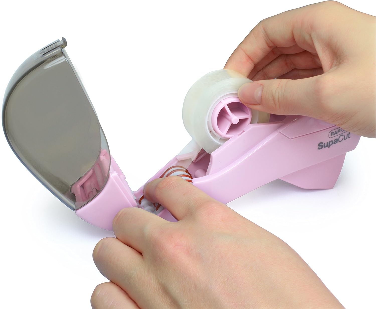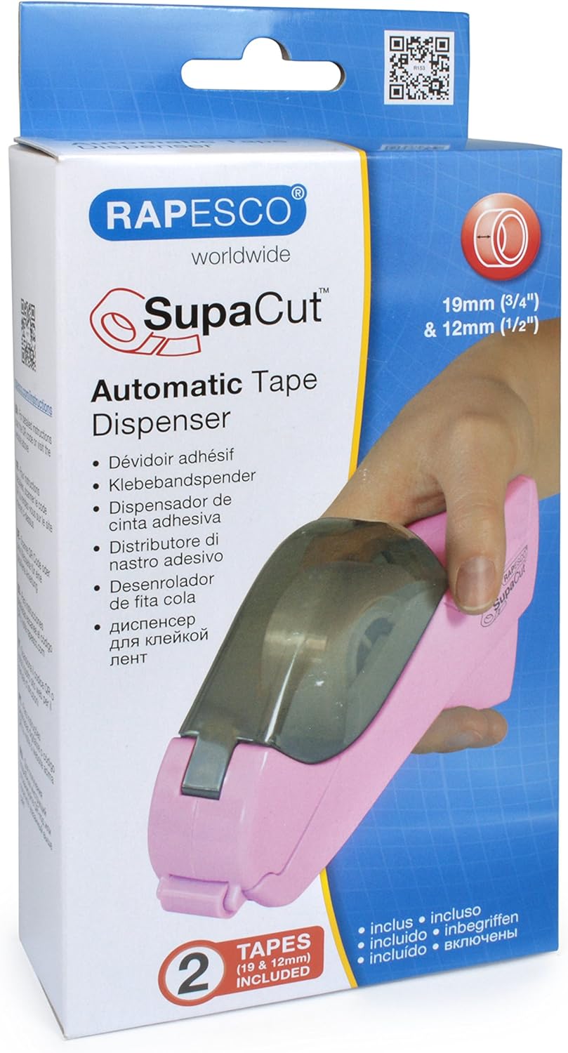 RAPESCO SupaCut tape dispenser, pastel pink, automatic tape cutter, handheld dispenser, safe concealed blade, no batteries required, two rolls included 19 mm x 20 m and 12 mm x 20 m, 25 mm core compatible, durable and ergonomic design, school and office tape dispenser, 3-year warranty |