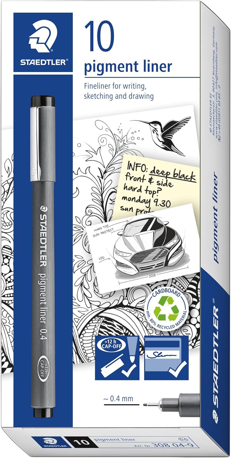STAEDTLER Pigment Liner 308 technical fineliner pen, black ink, 0.4 mm tip, waterproof, lightfast, archival ink, cap off 12h, airplane safe, fine line for drawing, sketching and writing |