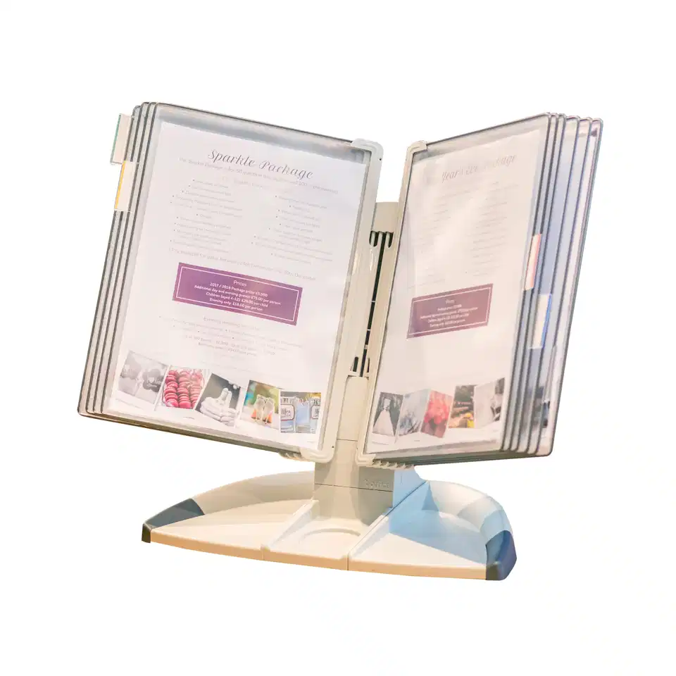 Ergonomický stolový prezentačný systém pre dokumenty formátu A4. Polypropylénové vrecká vystužené oceľovým drôtom a integrovaný uhol otvorenia zabezpečujú pohodlné čítanie a praktické používanie v každodennej prevádzke.