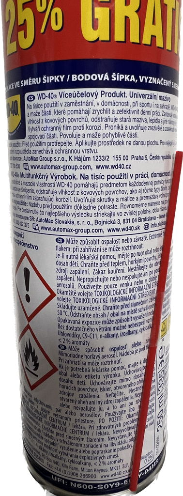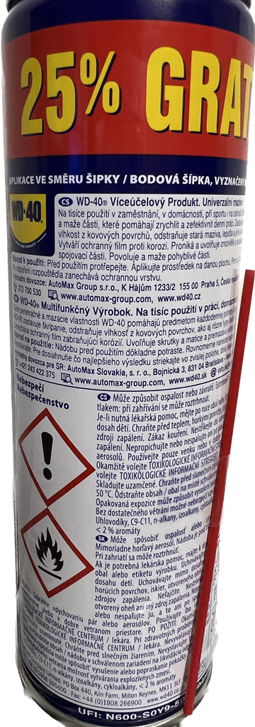 Mazivo WD-40 má výrobcom určený objem: 250 ml